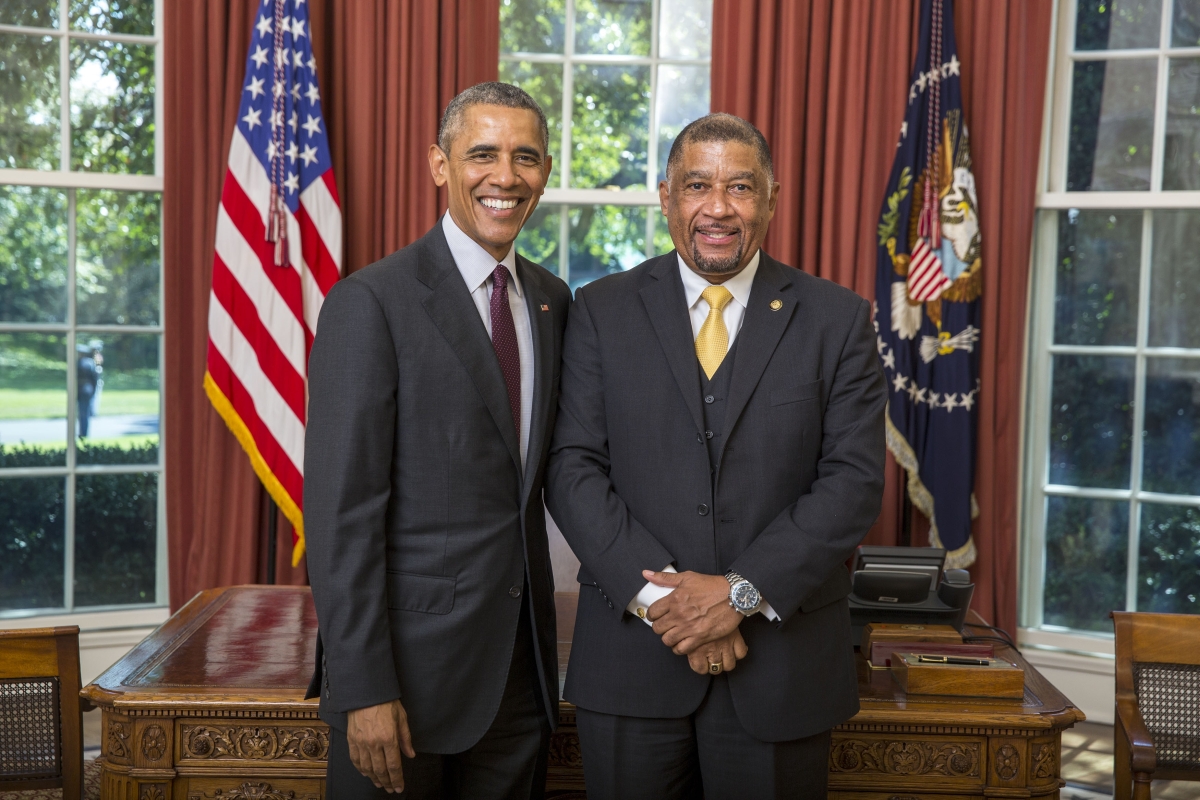 His Excellency, Ralph Samuel Thomas (right) presents his credentials to US President Barack Obama at the White House.